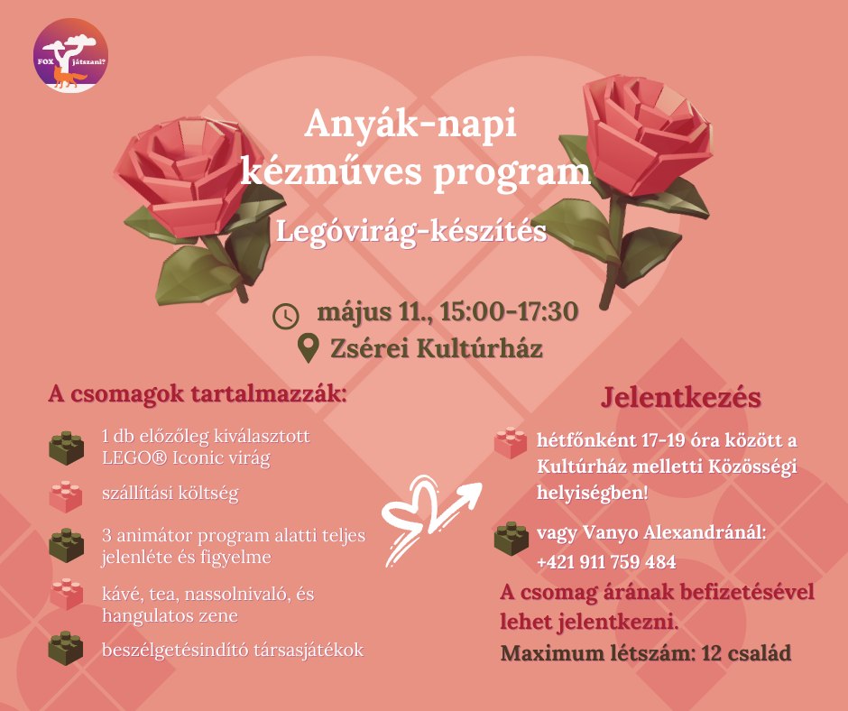 2024. május 11-én egy izgalmas, egyedi és hangulatos anyák napi programot fogunk tartani, ahol különböző legóvirágok tudnak általatok elkészülni. Az általatok összerakott legóvirágok természetesen az otthonotokat fogják díszíteni a program után.