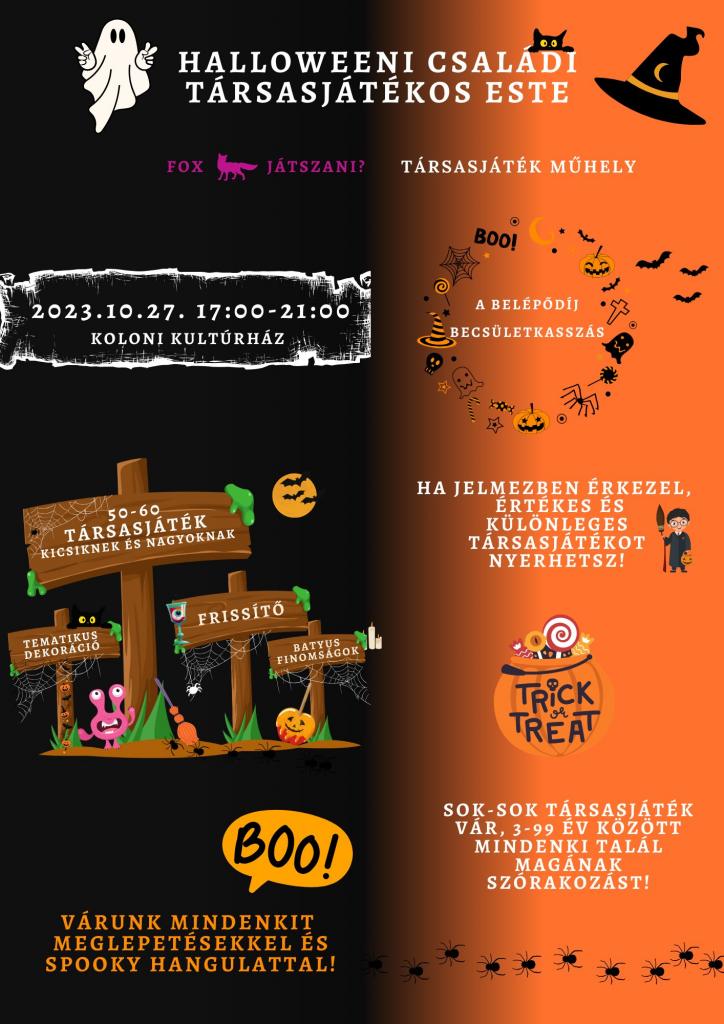 Szeretettel meghívunk mindenkit, gyerekeket és felnőtteket egyaránt egy kis spooky halloweeni hangulattal megfűszerezett társasjátékos estére, melyre már jövő pénteken, 2023. október 27-én 17:00 órai kezdettel kerül sor a koloni kultúrházban. Mindenkit szeretettel várunk!