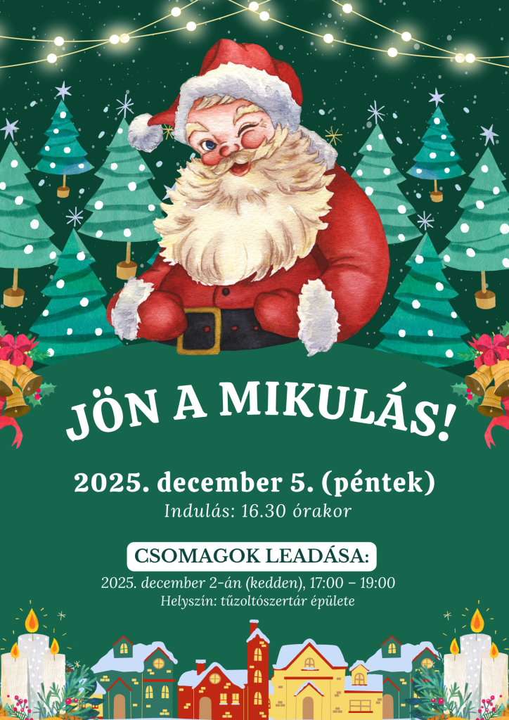 Értesítjük a kedves lakosságot, hogy idén is ellátogat községünkbe a Mikulás, szorgos segítőivel együtt. December 5-én (pénteken) 16:30-kor érkezik, és végigmegy a falu minden utcáján.