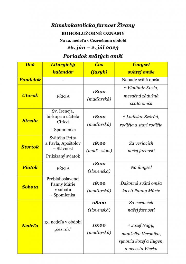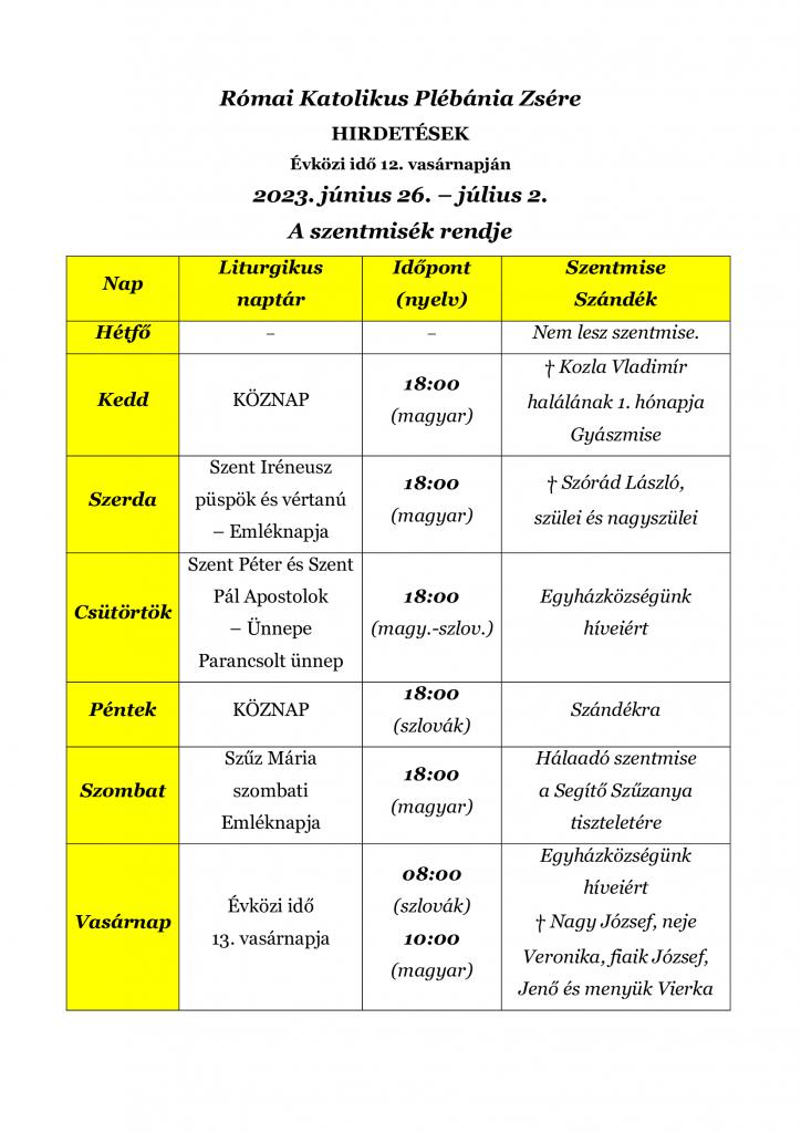 SZENTMISÉK RENDJE (2023. JÚNIUS 26. –...