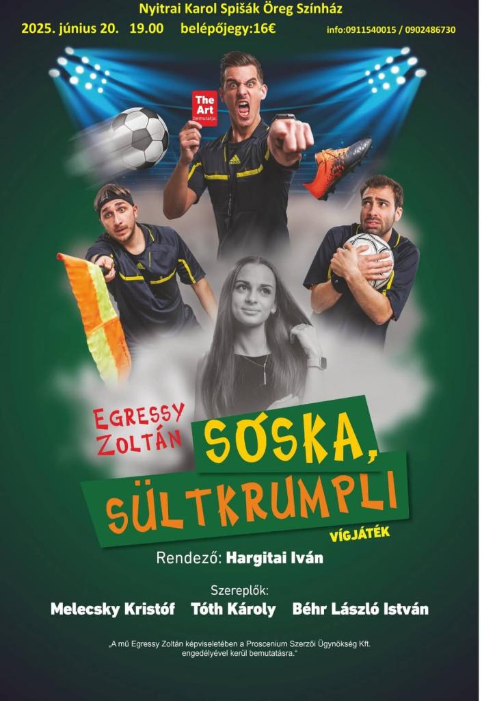Tisztelettel meghívunk mindenkit a "Sóska, sültkrumpli" című magyar nyelvű vígjátékra, melyre 2025. június 20-án (pénteken) 19:00 órai kezdettel kerül sor a nyitrai Karol Spišák Színházban (egykori bábszínház).
