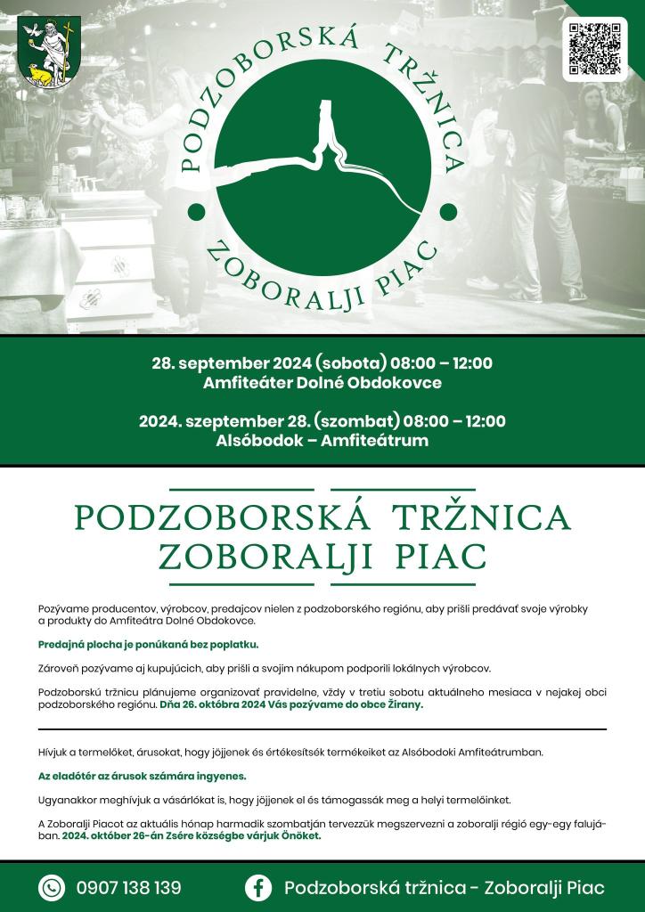 A következő ZOBORALJI PIAC Zsérén kerül megrendezésre, 2024. október 26-án (szombaton) 8:00 és 12:00 óra között a szabadidőközpontban.