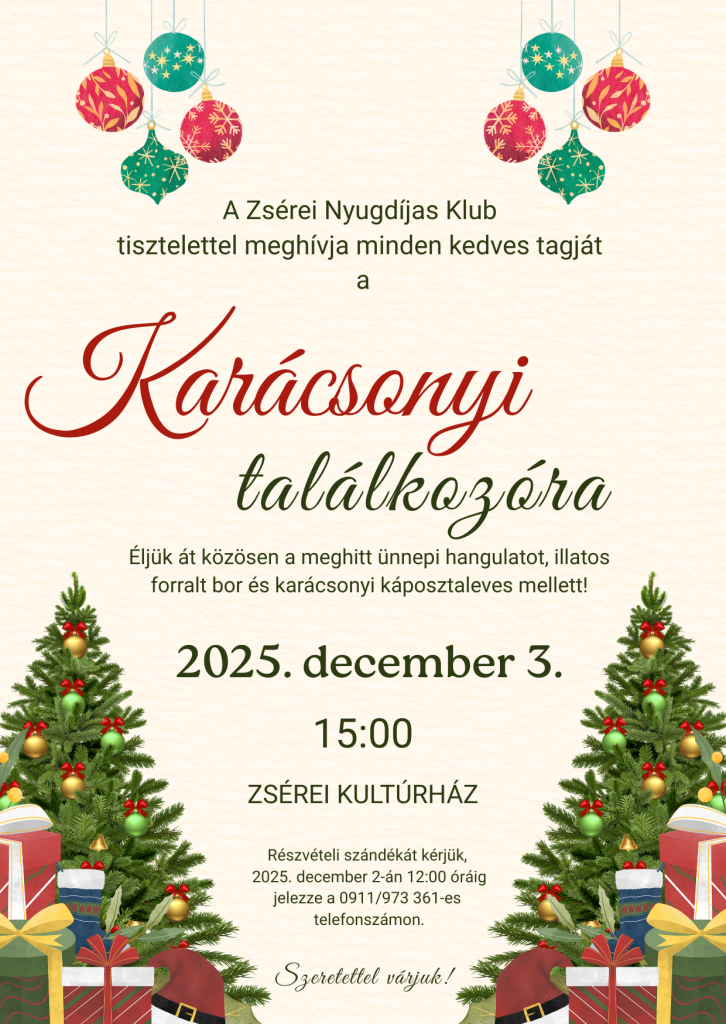 A Zsérei Nugdíjas Klub tisztelettel meghívja minden kedves tagját a karácsonyi találkozóra, melyre 2025. december 3-án 15:00 órai kezdettel kerül sor helyi kultúrházban. Részvételi szándékát kérjük legkésőbb december 2-án 12:00 óráig jelezze Gál Gabriellánál a 0911/973 361-es telefonszámon.