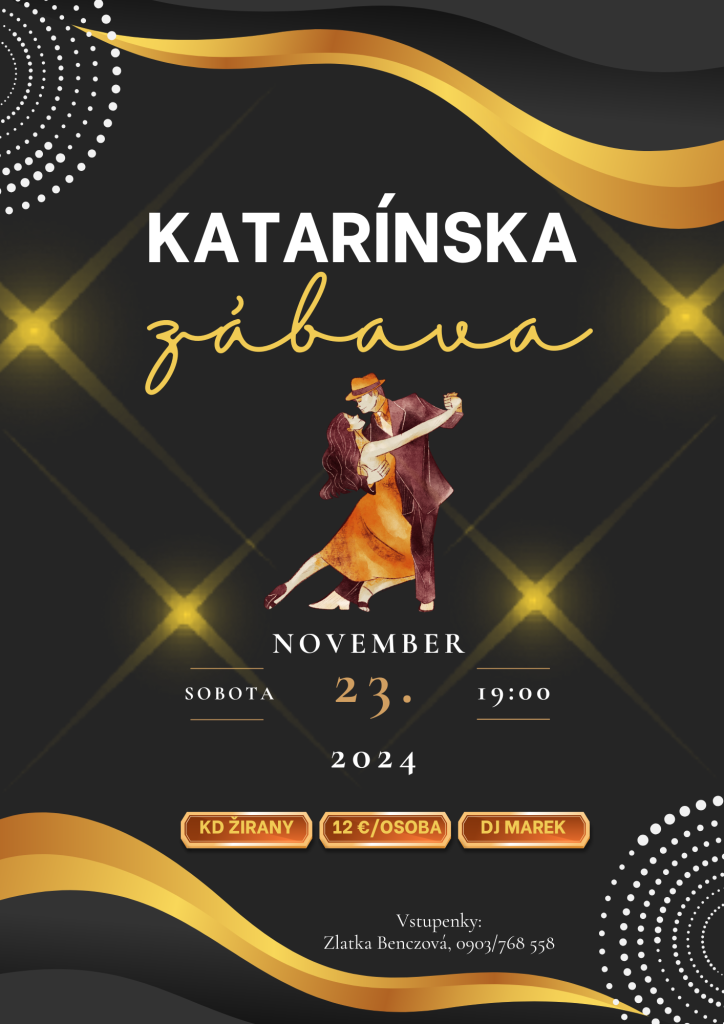 Srdečne Vás pozývame na KATARÍNSKU ZÁBAVU, ktorá sa uskutoční dňa 23. novembra 2024 (sobota) v kultúrnom dome v Žiranoch.