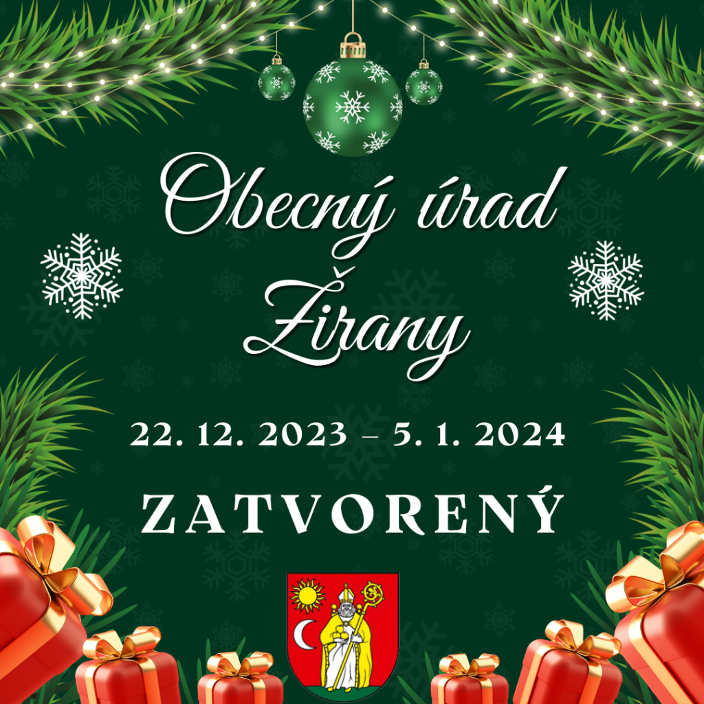 OBECNÝ ÚRAD ŽIRANY bude od 22. decembra 2023 (piatok) do 5. januára 2024 (piatok) ZATVORENÝ z dôvodu čerpania dovoleniek. V prípade potreby kontaktujte pána starostu obce: 0903/203 979. Ďakujeme!