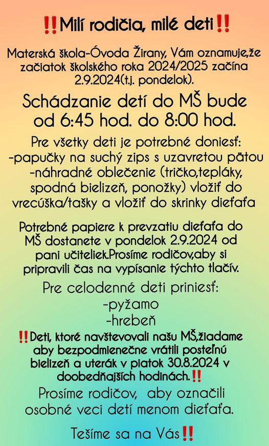 OZNAM - MATERSKÁ ŠKOLA - ÓVODA ŽIRANY Začiatok šk. roka 2024/2025
