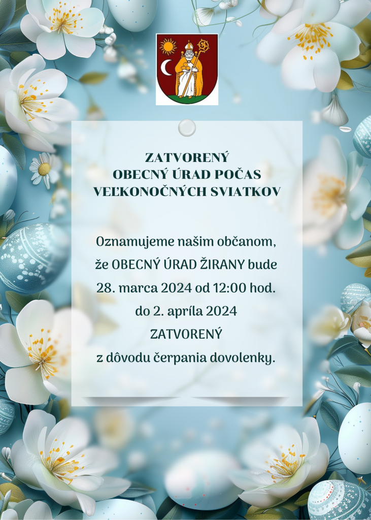 Oznamujeme našim občanom, že OBECNÝ ÚRAD ŽIRANY bude dňa 28. marca 2024 (štvrtok) od 12:00 hod. a 2. apríla 2024 (utorok) ZATVORENÝ z dôvodu čerpania dovolenky. Ďakujeme za porozumenie.