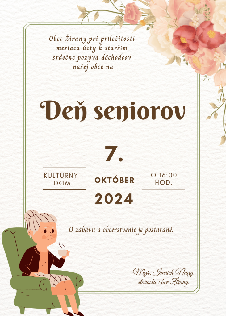 Samospráva obce Žirany srdečne pozýva dôchodcov našej obce na slávnostné posedenie pri príležitosti mesiaca úcty k starším, ktoré sa uskutoční dňa 7. októbra 2024 (pondelok) o 16:00 hod. v kultúrnom dome v Žiranoch.